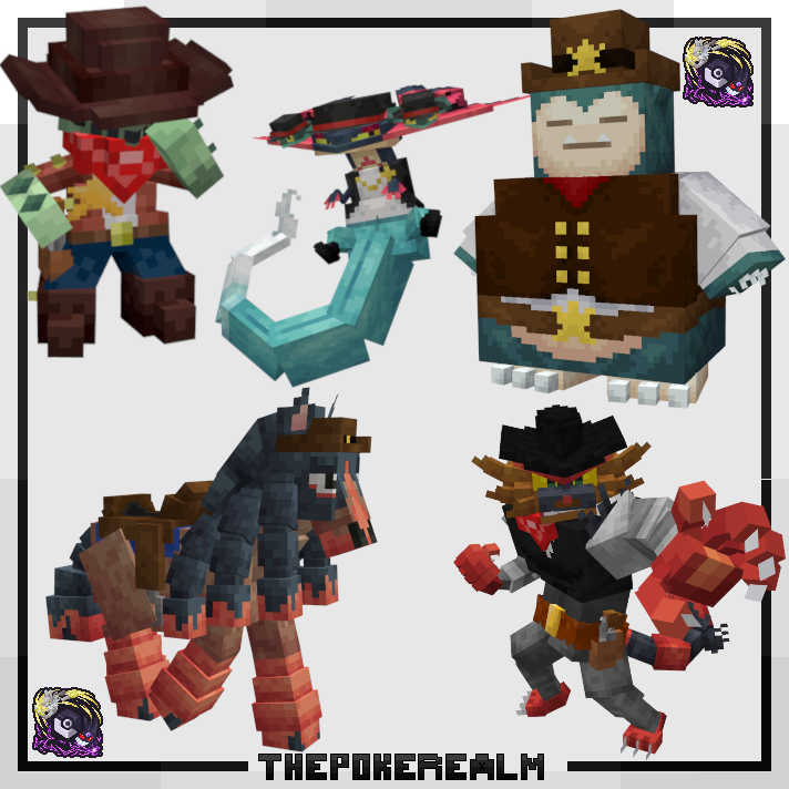 This Skin Bundle gives you the Five Cowboy Skins, Cowboy Snorlax, Dragapult, Incineroar, Cacturne and Mudsdale! You can use "/pokeskins" to use the skin GUI and apply the skins to your Pokémon, while the skin is applied these Pokémon cannot be traded. All Skins come with Shiny Variants if you apply them to a Shiny Pokémon!