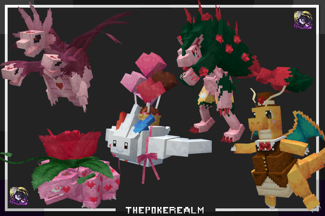 This Skin Bundle gives you the Five Valentines Skins, Valentines Dragonite, Togekiss, Zoroark, Venusaur and Hydreigon! You can use "/pokeskins" to use the skin GUI and apply the skins to your Pokémon, while the skin is applied these Pokémon cannot be traded.